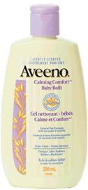 Available in 236 ml, Aveeno® Baby TM Calming Comfort TM Bath contains lavender and vanilla — natural ingredients known for their calming and relaxing properties. Combined with natural oatmeal, known for its skin-soothing benefits, this rich lathering cleanser helps retain moisture and gently soothes baby’s delicate skin, leaving skin feeling clean, soft and healthy-looking. This tear-free formula cleanses without drying because it is soap-free. It's even gentle enough for babies with sensitive skin. A study shows that bathing in a warm bath calms and relaxes babies, improving overall well-being. Bathing with Aveeno® Baby TM Calming Comfort TM Bath helps calm and comfort your baby before bedtime, naptime or anytime baby's a bit fussy.
